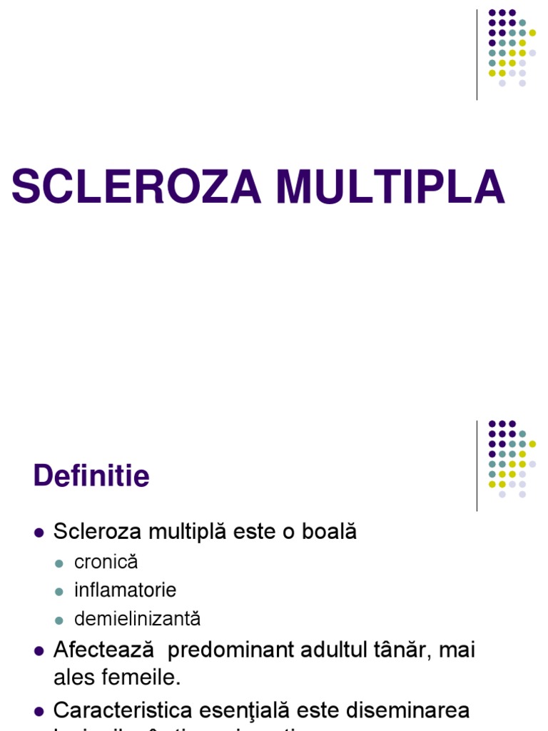 Scleroza multipla - cauze, simptome, tratament ... from sfaturimedicale.ro Scleroza multipla este o afectiune inflamatorie in cazul careia, celulele albe care lupta impotriva infectiilor in mod normal, patrund la nivelul sistemului nervos si cauzeaza diverse probleme. In cazul sclerozei multiple, creierul intampina dificultati in a receptiona mesajele transmise de restul corpului. Academia.edu is a platform for academics to share research papers. Din 2017 am fost diagnosticata cu scleroza multipla. Scleroza multiplă (scleroza în plăci) este o boală progresivă și inflamatorie a sistemului nervos central (snc). Un episod simptomatic nu dureaza mai mult de 24 de ore si se poate repeta o data la cateva zile, luni sau chiar ani. În prezent scleroza multiplă este o afecțiune incurabilă, iar boala afecteză 2,3 milioane de oameni în întreaga lume din care aproximativ 400.000 în sua și 100.000 în marea britanie. De ce să accesați noi tratamente pentru scleroza multiplă cu thesocialmedwork?